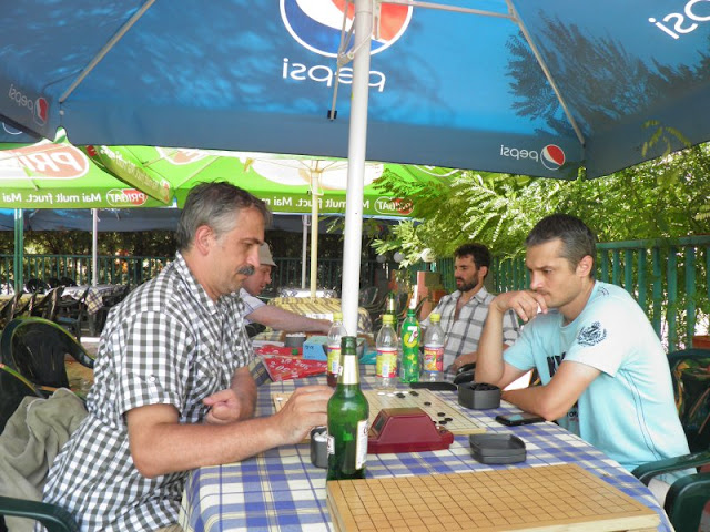 Iulian, mai tînăr și mai pregătit, a fost în avangardă. În runda imortalizată în imagine e prezent ceasul Ing, dar și telefonul său folosit pe post de kifu. Într-o altă rundă a fost folosit pe post de ceas de joc. Eu, rămas mai în urmă cu tehnica, mă cam uitam ca găina la jucăria lui. Cu doar un cincinal mai tîrziu, văzînd că practic dacă nu ai smartphone decazi la statutul de analfabet, am făcut saltul către lumea inteligenței portabile.